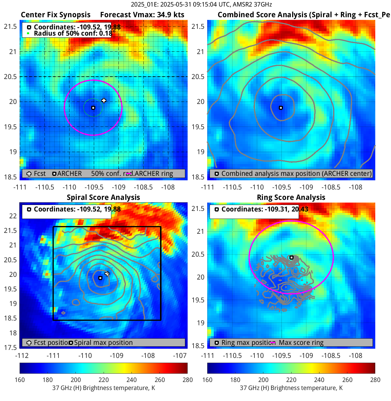 % cert. of eye: Percent certainty that an eye exists in this image, determined by ARCHER. Currently only available for IR and 85-92 GHz imagery.