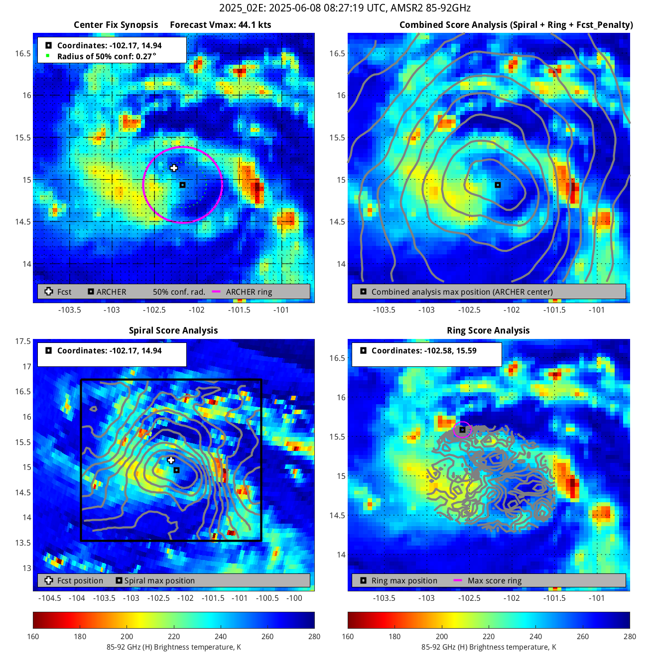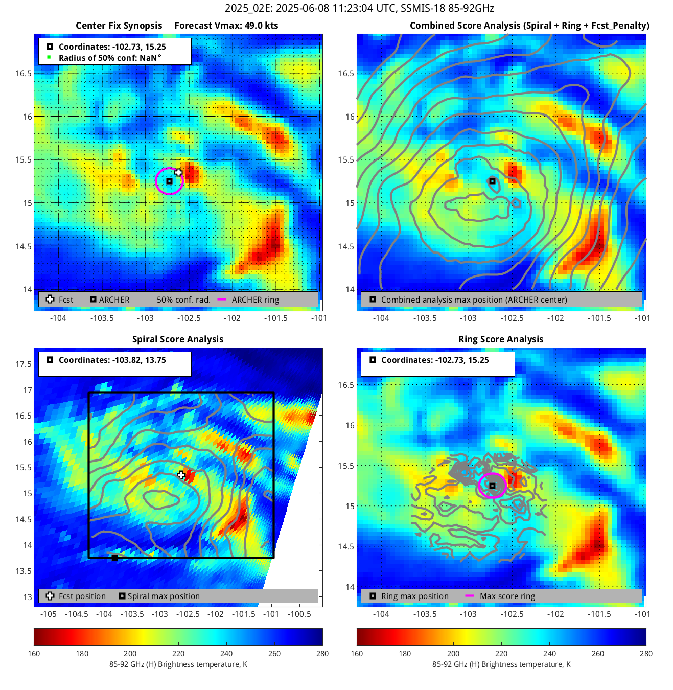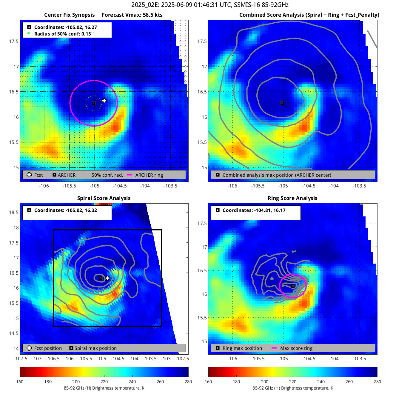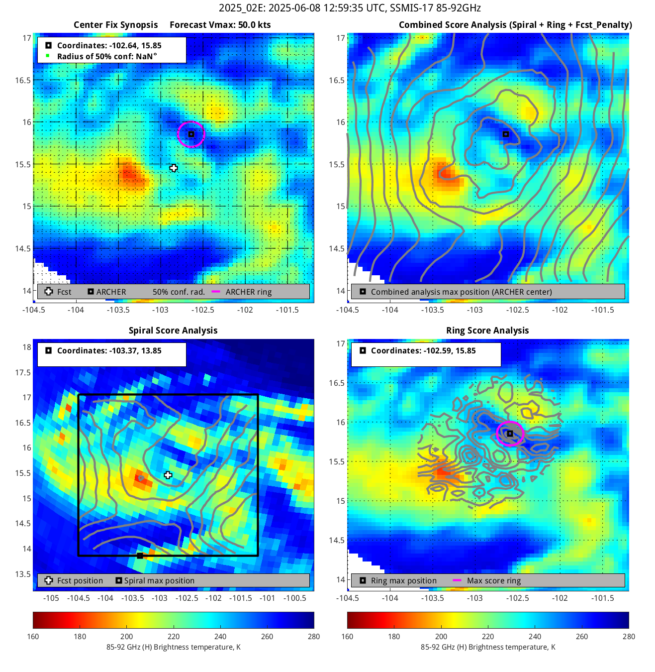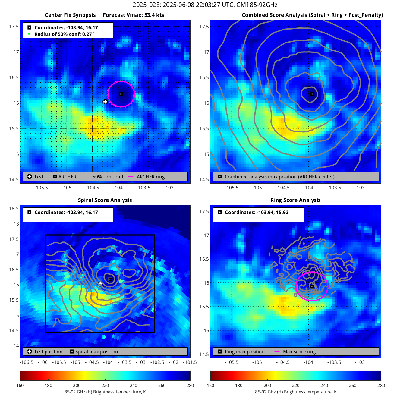 % cert. of eye: Percent certainty that an eye exists in this image, determined by ARCHER. Currently only available for IR and 85-92 GHz imagery.