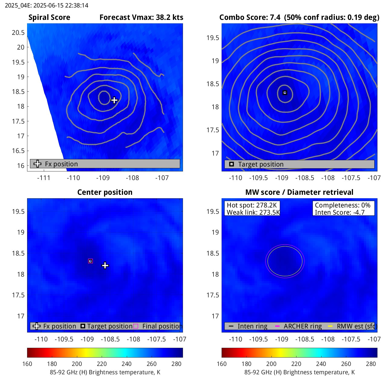 | 20250615T223814 | ssmis18_85 | 88.8 | 39.5 | 0.0% | 4.7 | -4.7 | n/a | 38.2 kts |