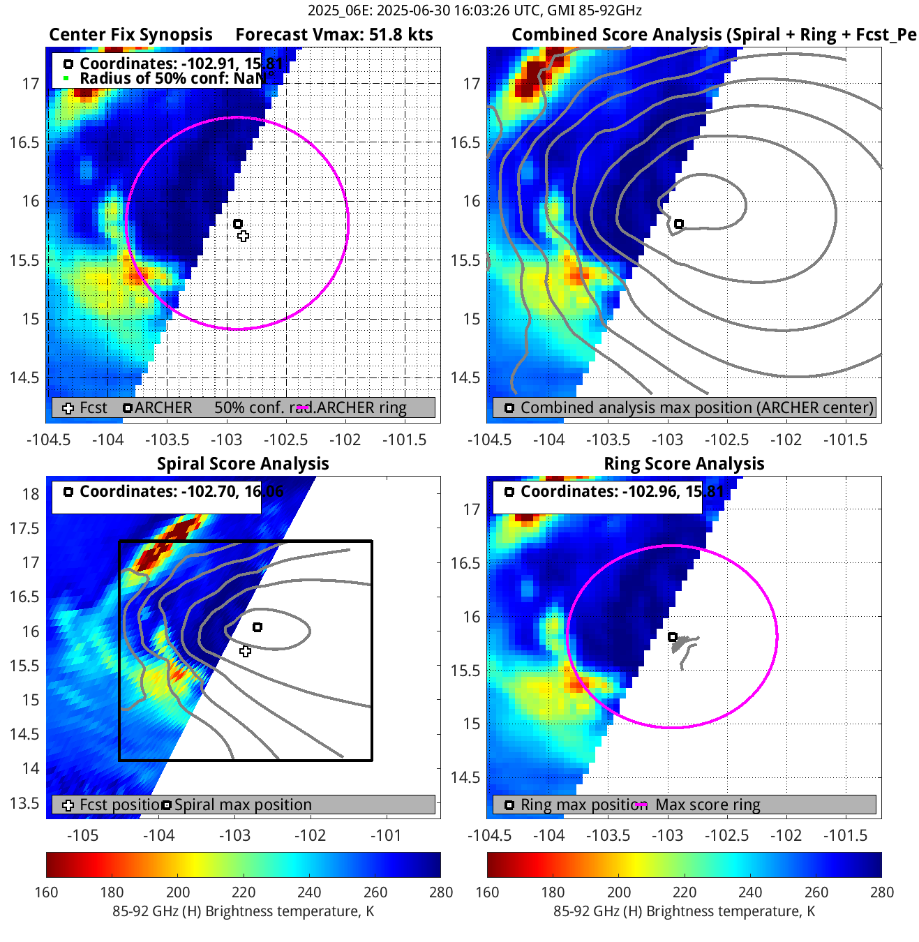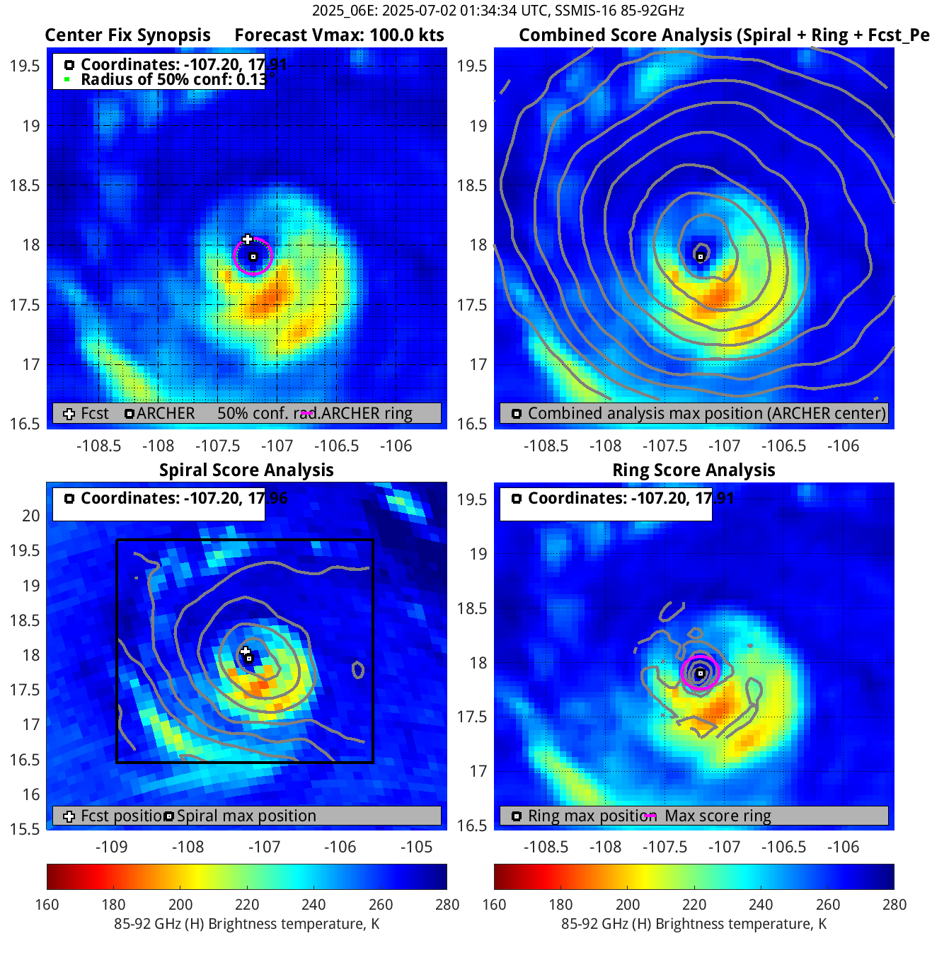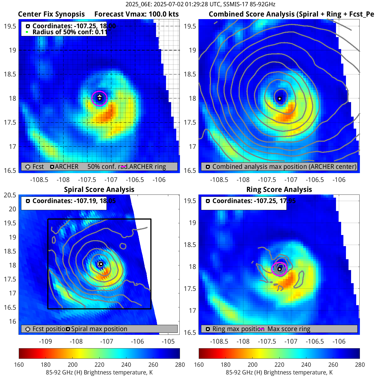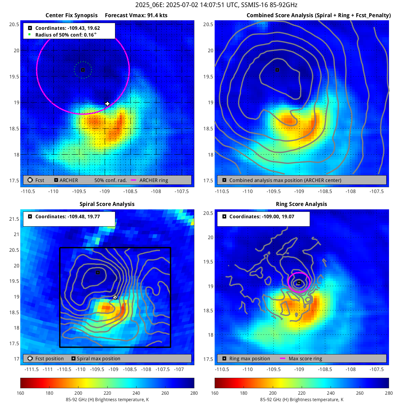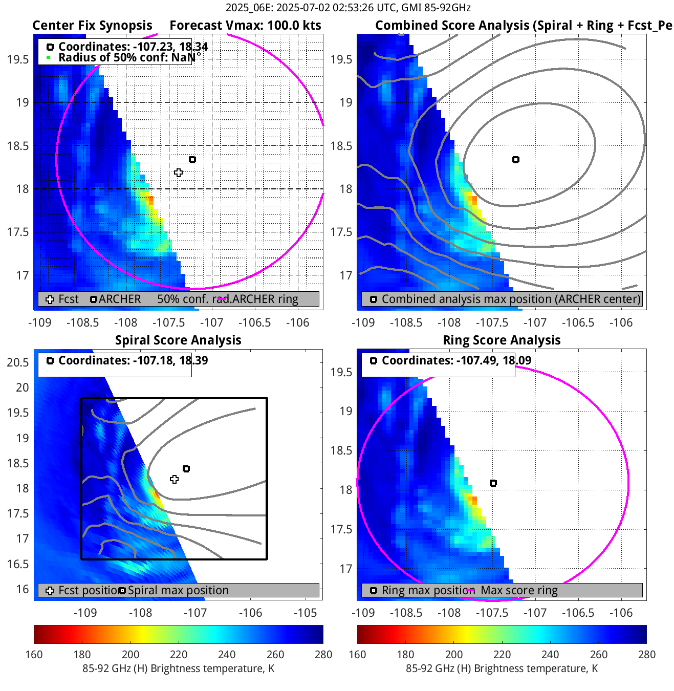 % cert. of eye: Percent certainty that an eye exists in this image, determined by ARCHER. Currently only available for IR and 85-92 GHz imagery.
