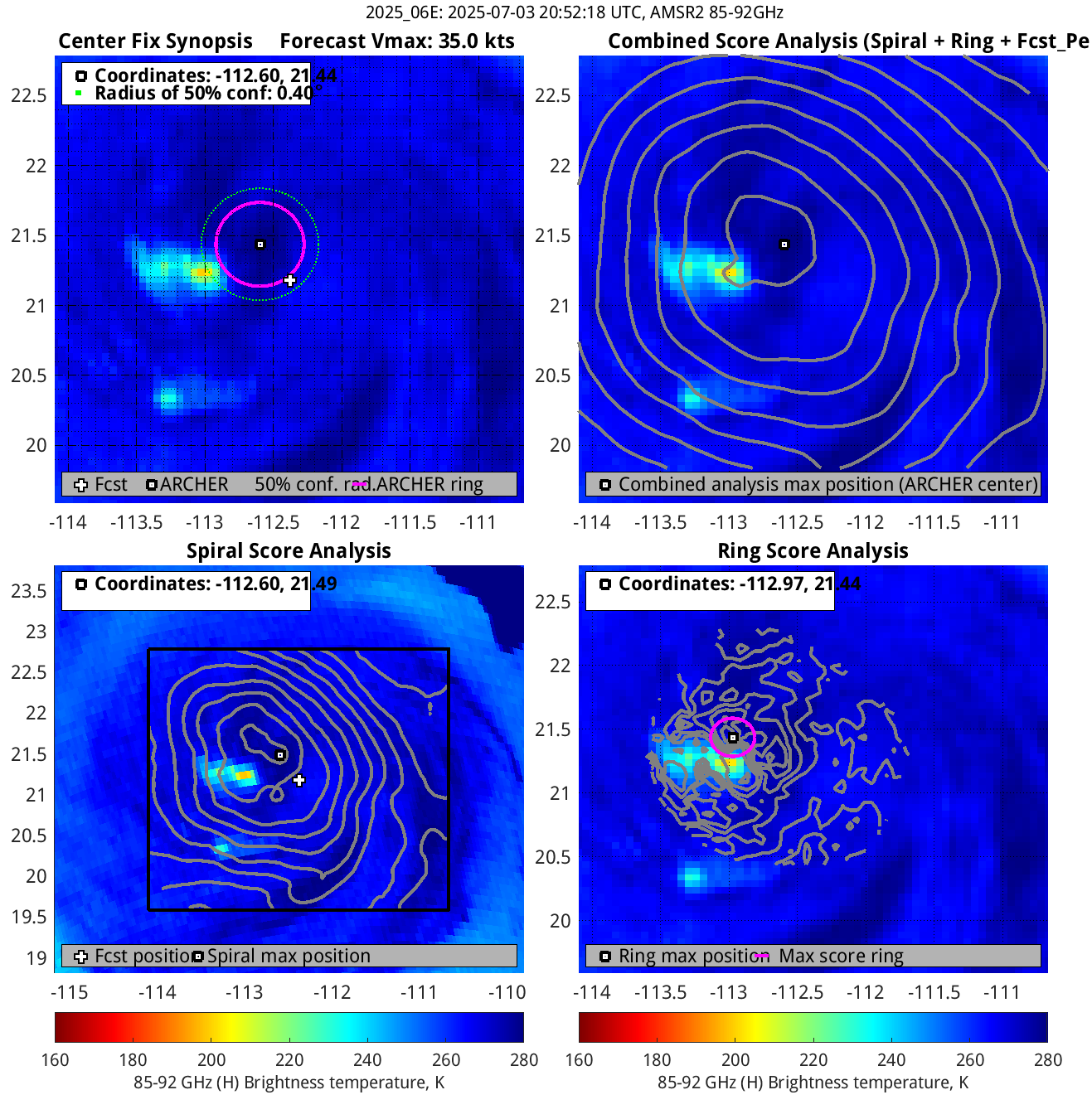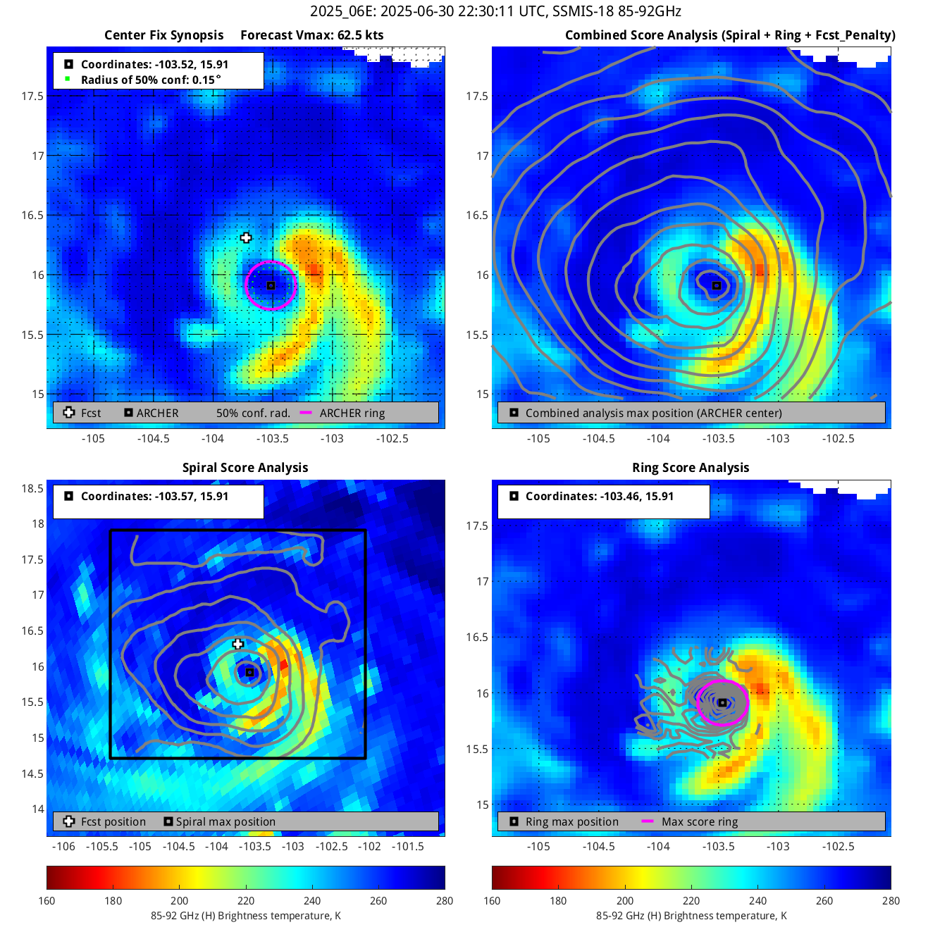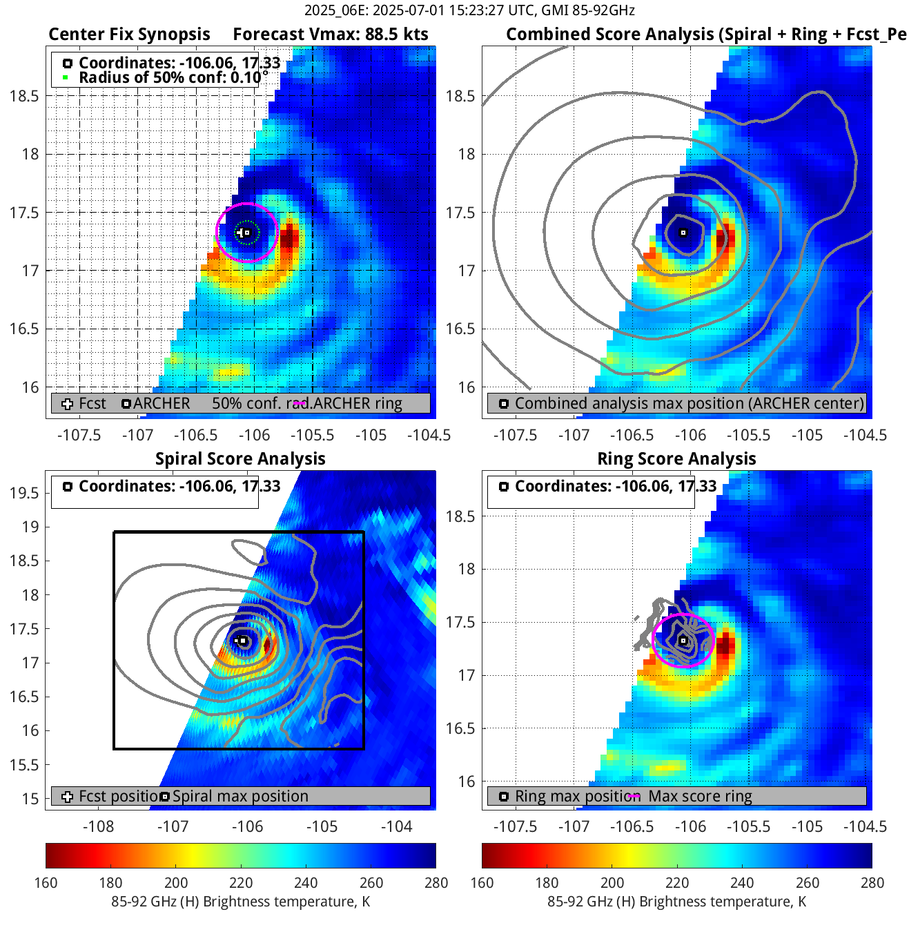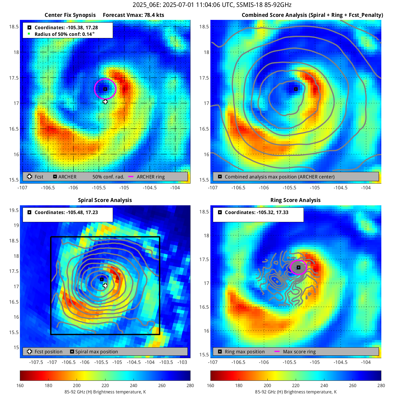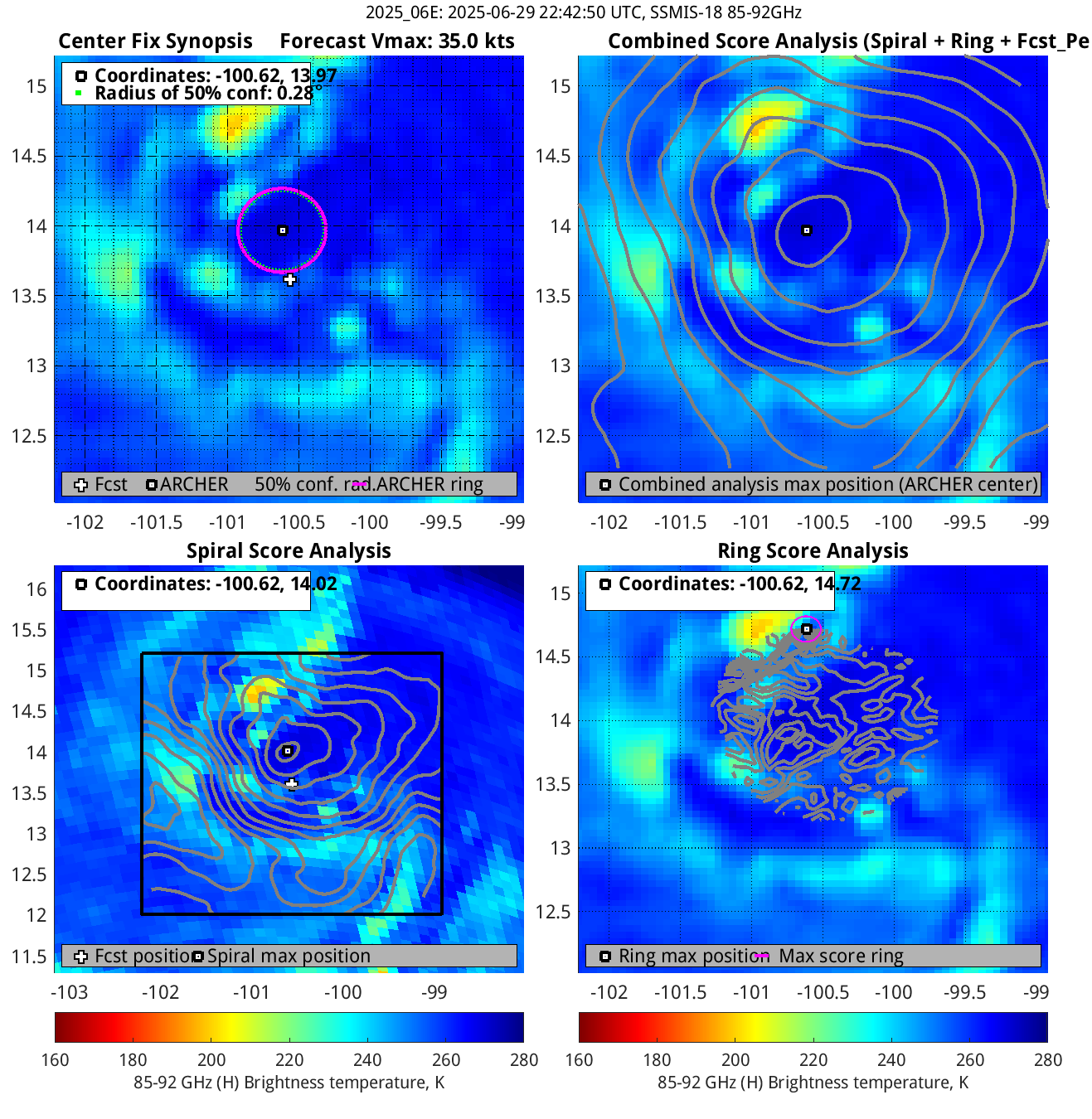 % cert. of eye: Percent certainty that an eye exists in this image, determined by ARCHER. Currently only available for IR and 85-92 GHz imagery.