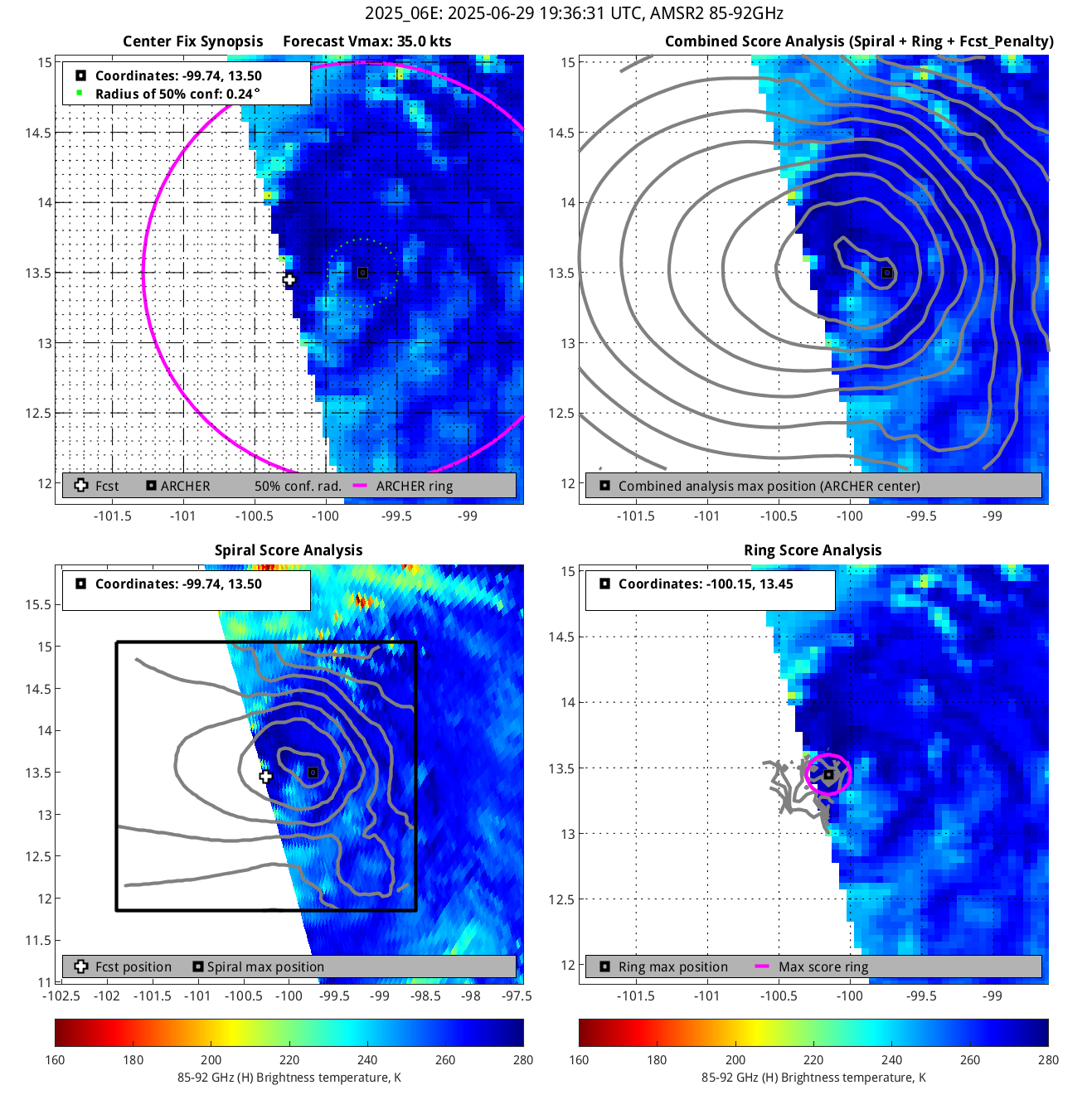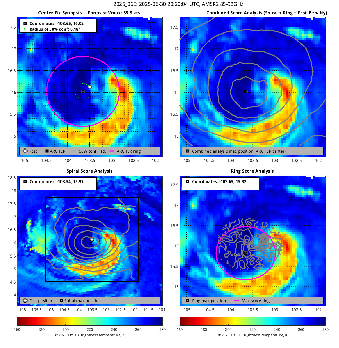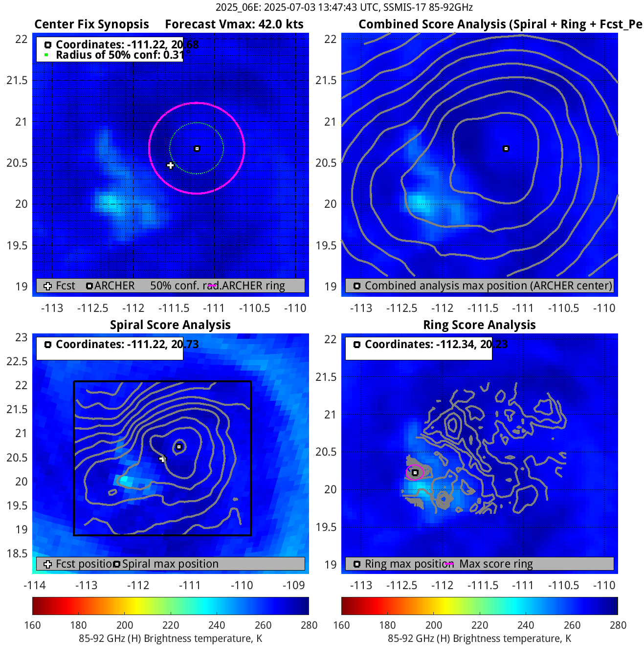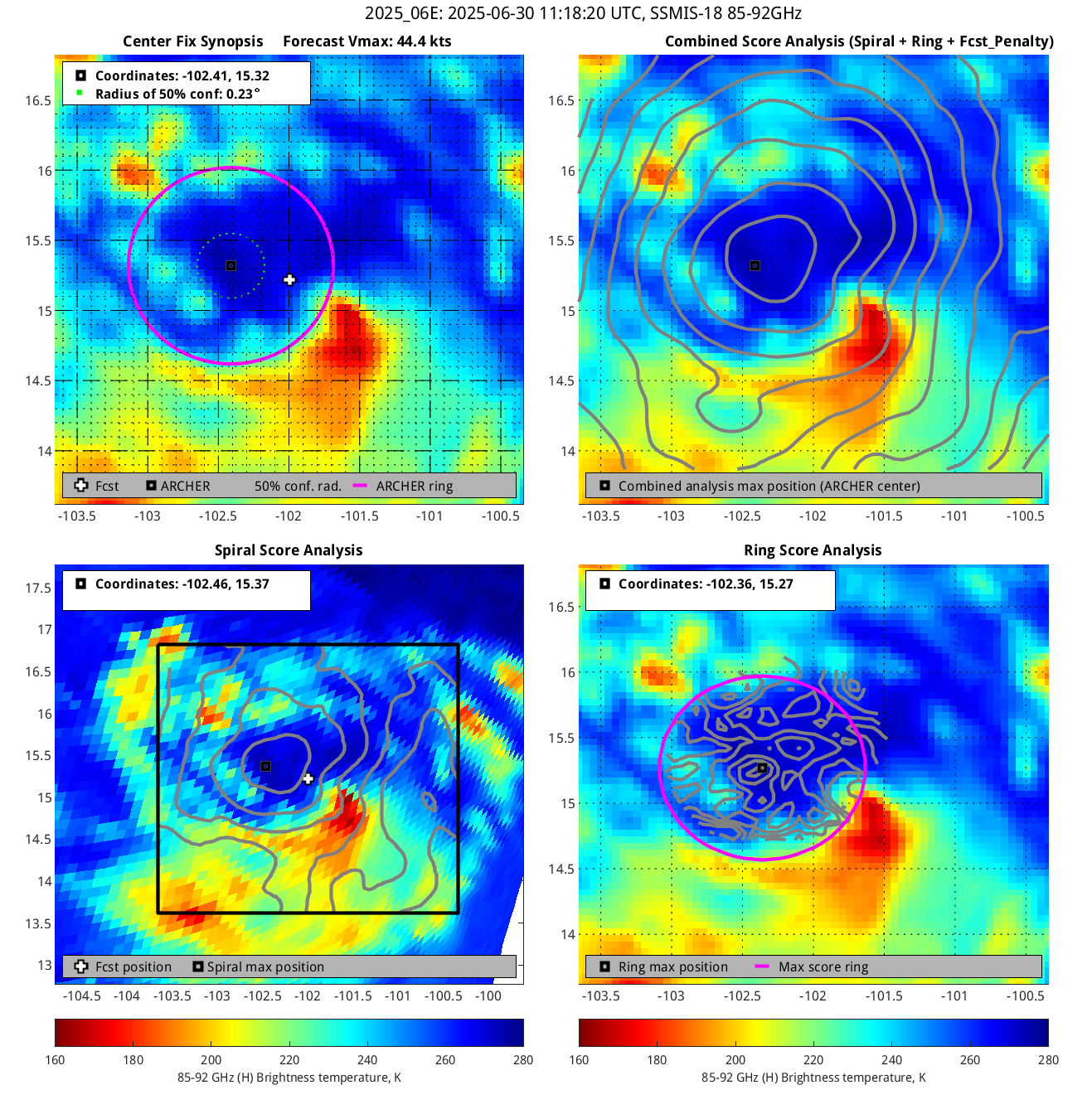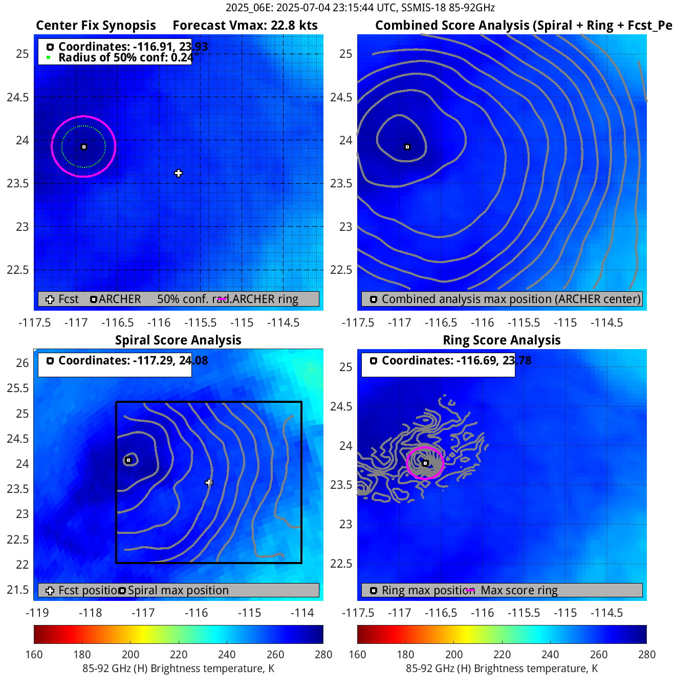 % cert. of eye: Percent certainty that an eye exists in this image, determined by ARCHER. Currently only available for IR and 85-92 GHz imagery.