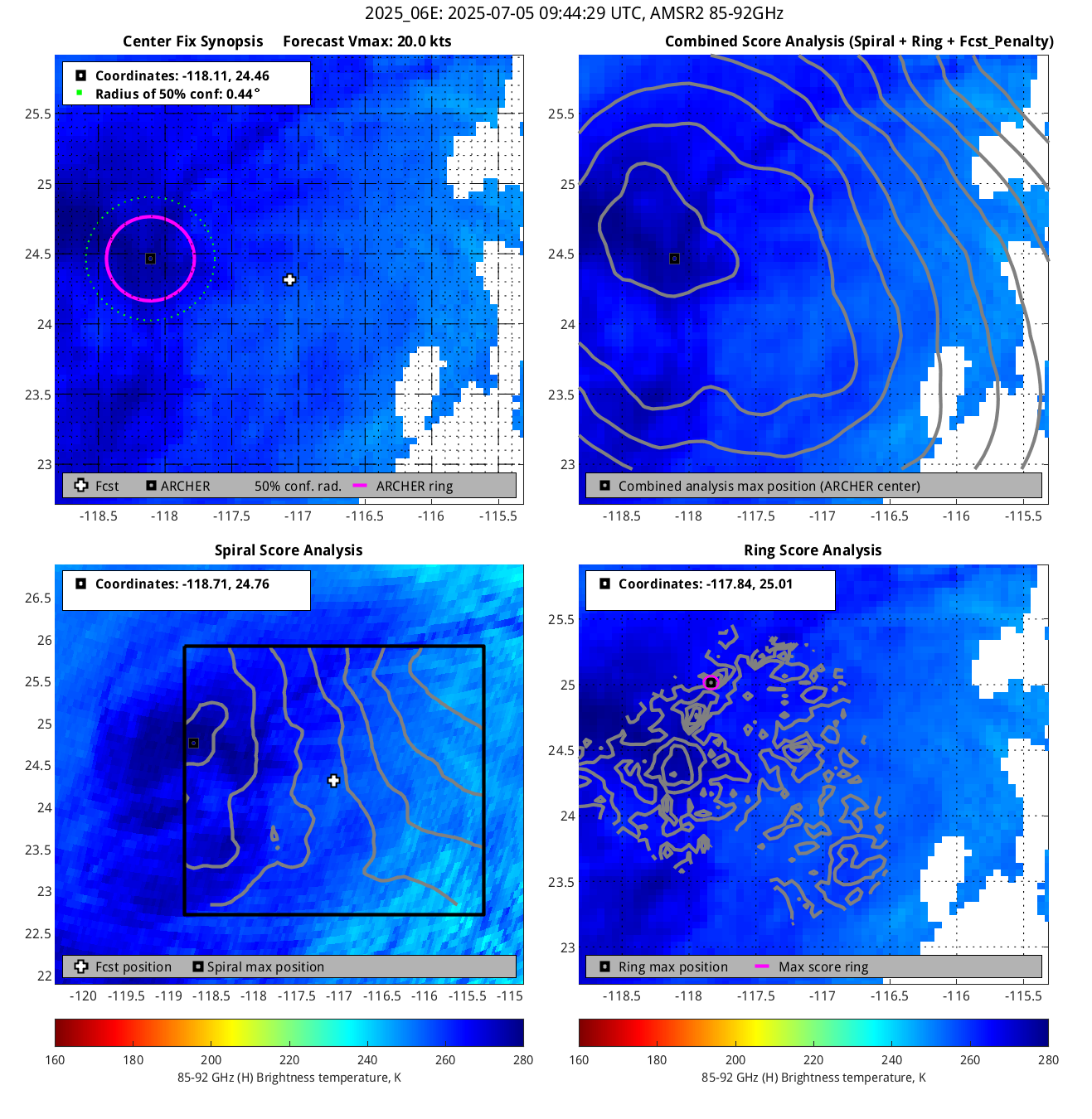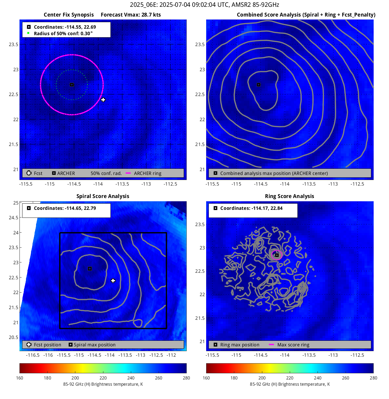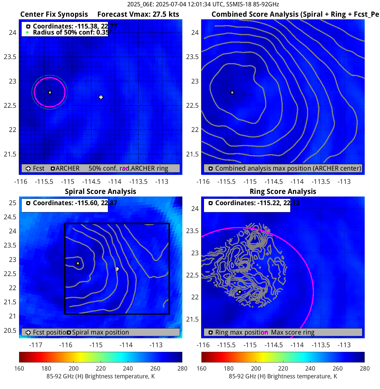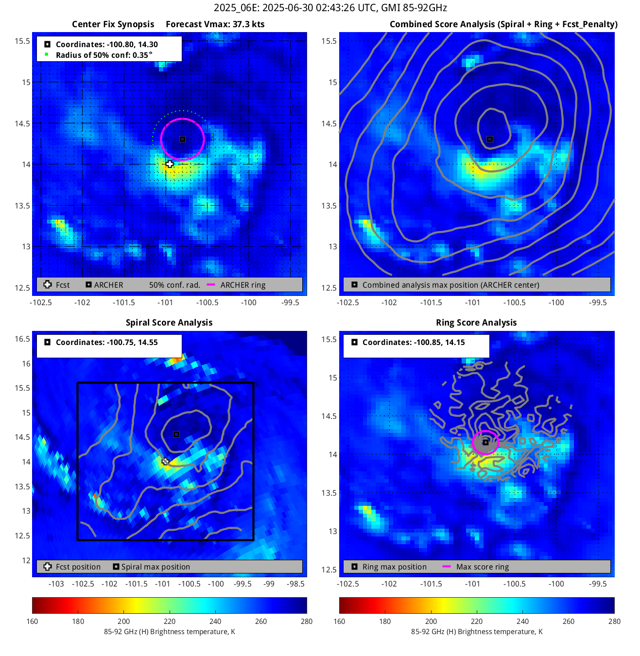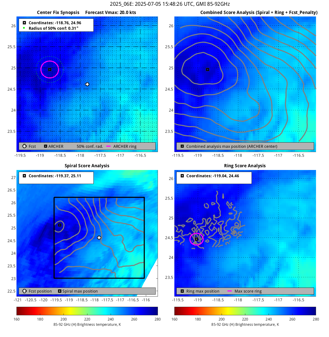 % cert. of eye: Percent certainty that an eye exists in this image, determined by ARCHER. Currently only available for IR and 85-92 GHz imagery.