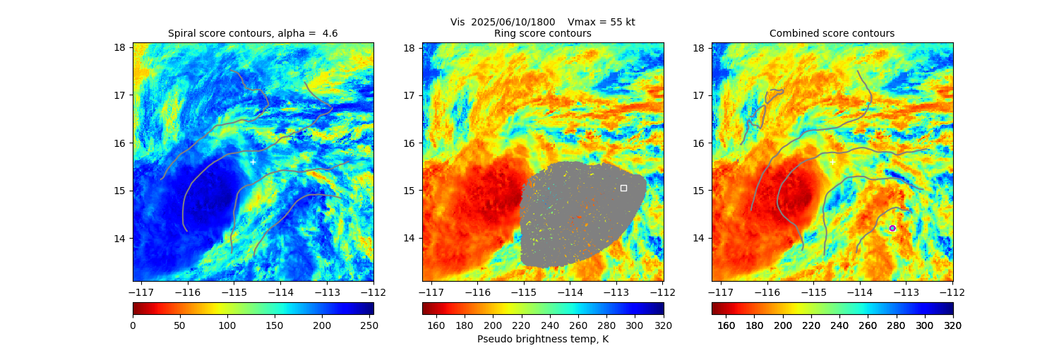 Key: - Date/Time: UTC time. If this observation is used in the track it is marked with a "*". If it is used for its own 30-minute window, it is put in bold. - Source/sensor: Satellite source of the analyzed image. - Vmax: Maximum winds listed in the forecast center analysis/forecast, *not* ARCHER. - ARCHER lat/lon: Coordinates of the ARCHER algorithm, valid at the time of the observation. If no center fix could be found, then it is "***". - Geo ref lat/lon: Coordinates of the ARCHER algorithm, valid at the time of the *nearest geo image*. - 50% cert. rad.: Radius of the circle (in degrees) that defines the area in which the ARCHER center of rotation is 50% certain. The lower the number, the more certain the position. - 95% cert. rad.: Radius of the circle (in degrees) that defines the area in which the ARCHER center of rotation is 95% certain. - Eye diam (deg): ARCHER-resolved eye diameter (in degrees). Green: robust, yellow: less certain, red: not robust. - % cert. of eye: Percent certainty that an eye exists in this image, determined by ARCHER. Currently only available for IR and 85-92 GHz imagery.