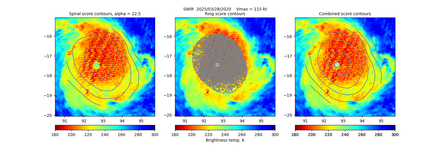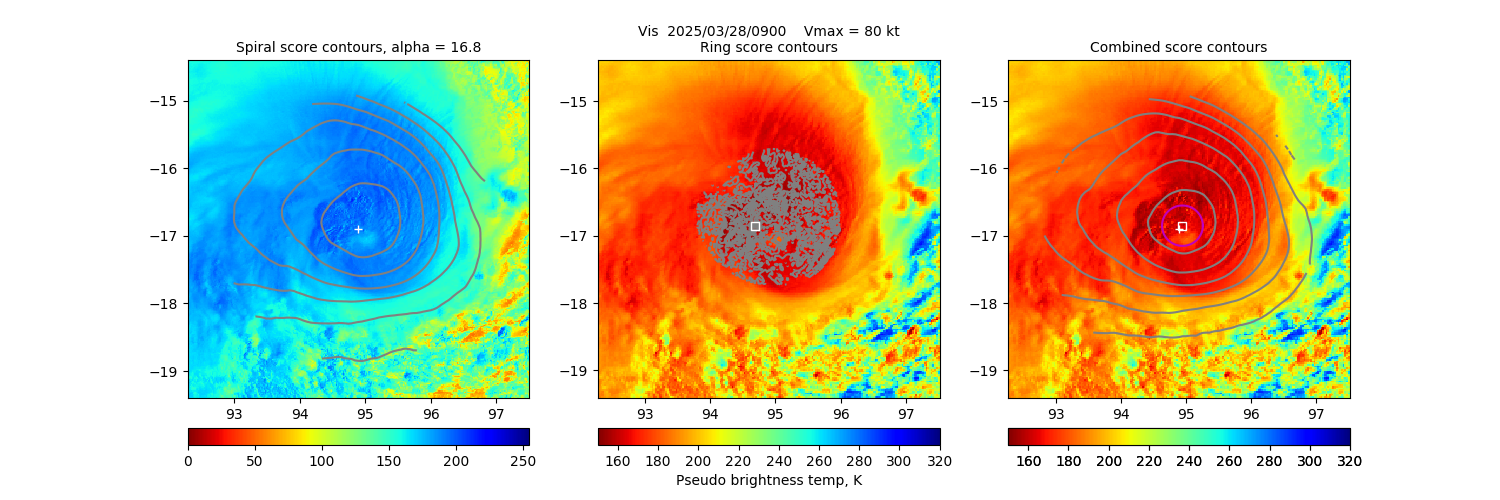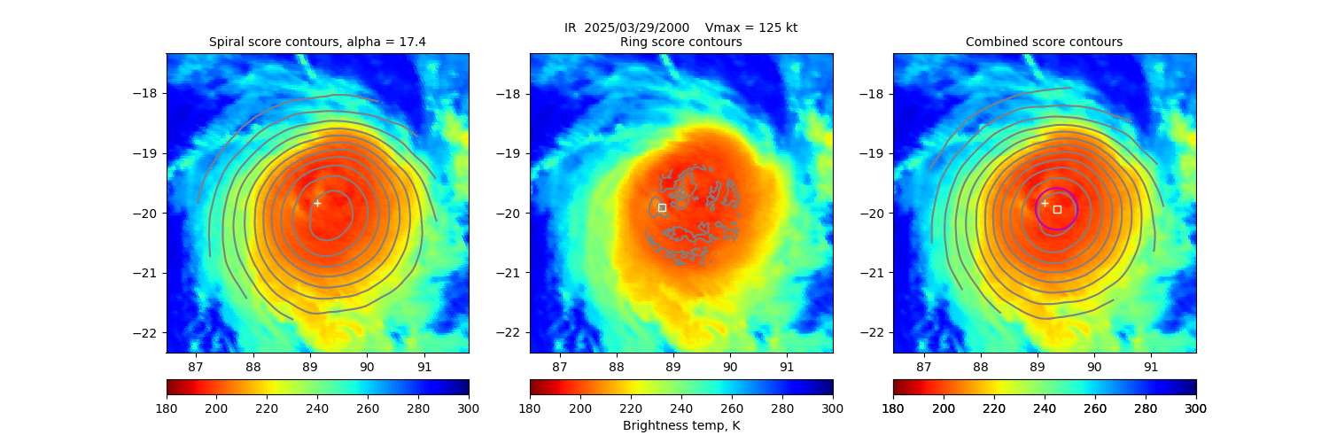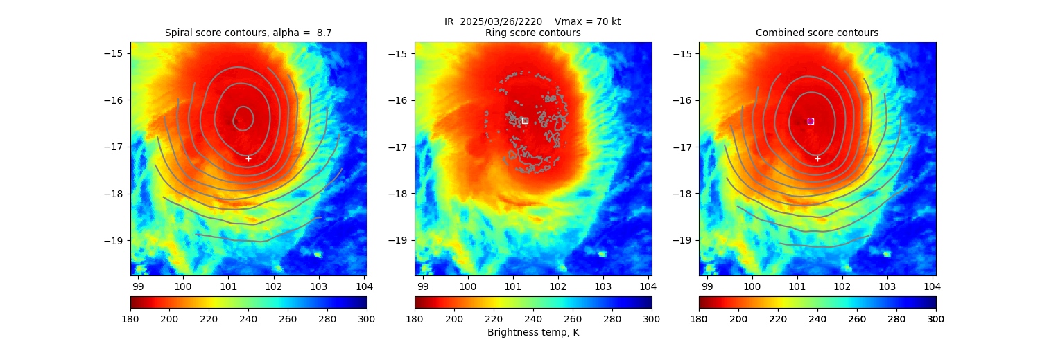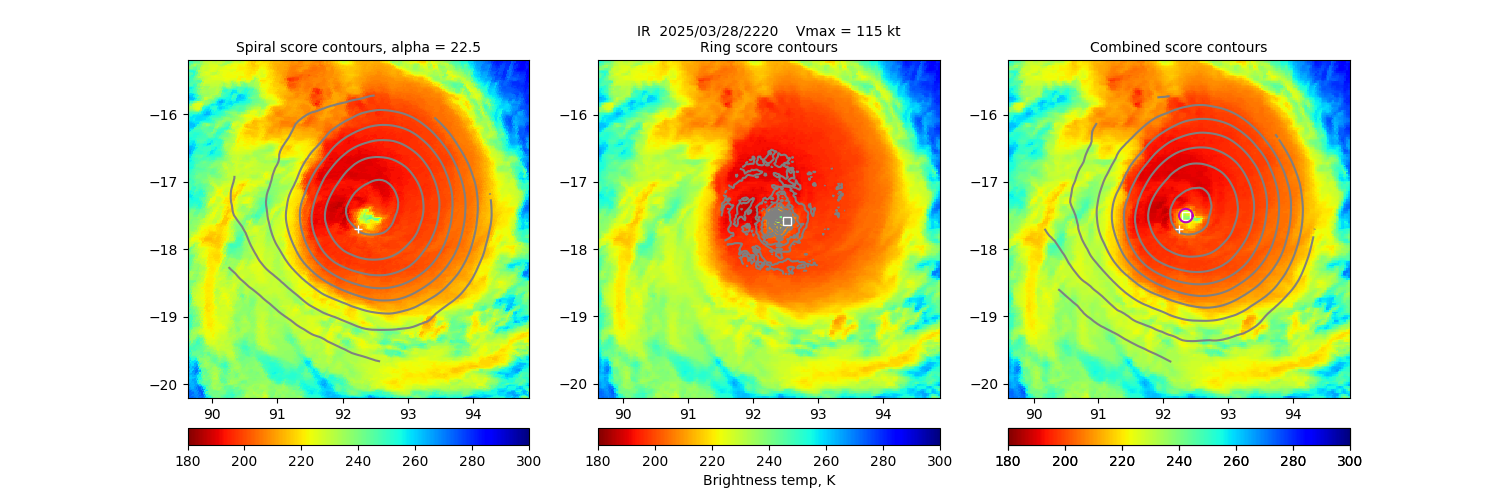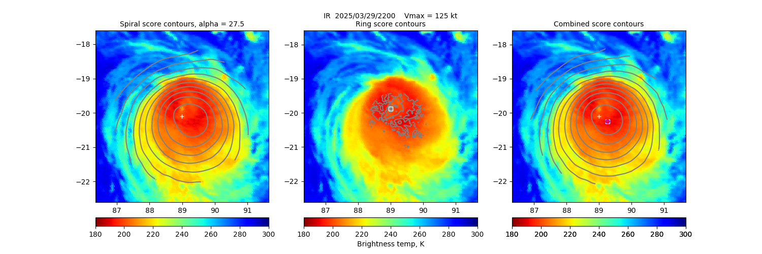 Key: - Date/Time: UTC time. If this observation is used in the track it is marked with a "*". If it is used for its own 30-minute window, it is put in bold. - Source/sensor: Satellite source of the analyzed image. - Vmax: Maximum winds listed in the forecast center analysis/forecast, *not* ARCHER. - ARCHER lat/lon: Coordinates of the ARCHER algorithm, valid at the time of the observation. If no center fix could be found, then it is "***". - Geo ref lat/lon: Coordinates of the ARCHER algorithm, valid at the time of the *nearest geo image*. - 50% cert. rad.: Radius of the circle (in degrees) that defines the area in which the ARCHER center of rotation is 50% certain. The lower the number, the more certain the position. - 95% cert. rad.: Radius of the circle (in degrees) that defines the area in which the ARCHER center of rotation is 95% certain. - Eye diam (deg): ARCHER-resolved eye diameter (in degrees). Green: robust, yellow: less certain, red: not robust. - % cert. of eye: Percent certainty that an eye exists in this image, determined by ARCHER. Currently only available for IR and 85-92 GHz imagery.