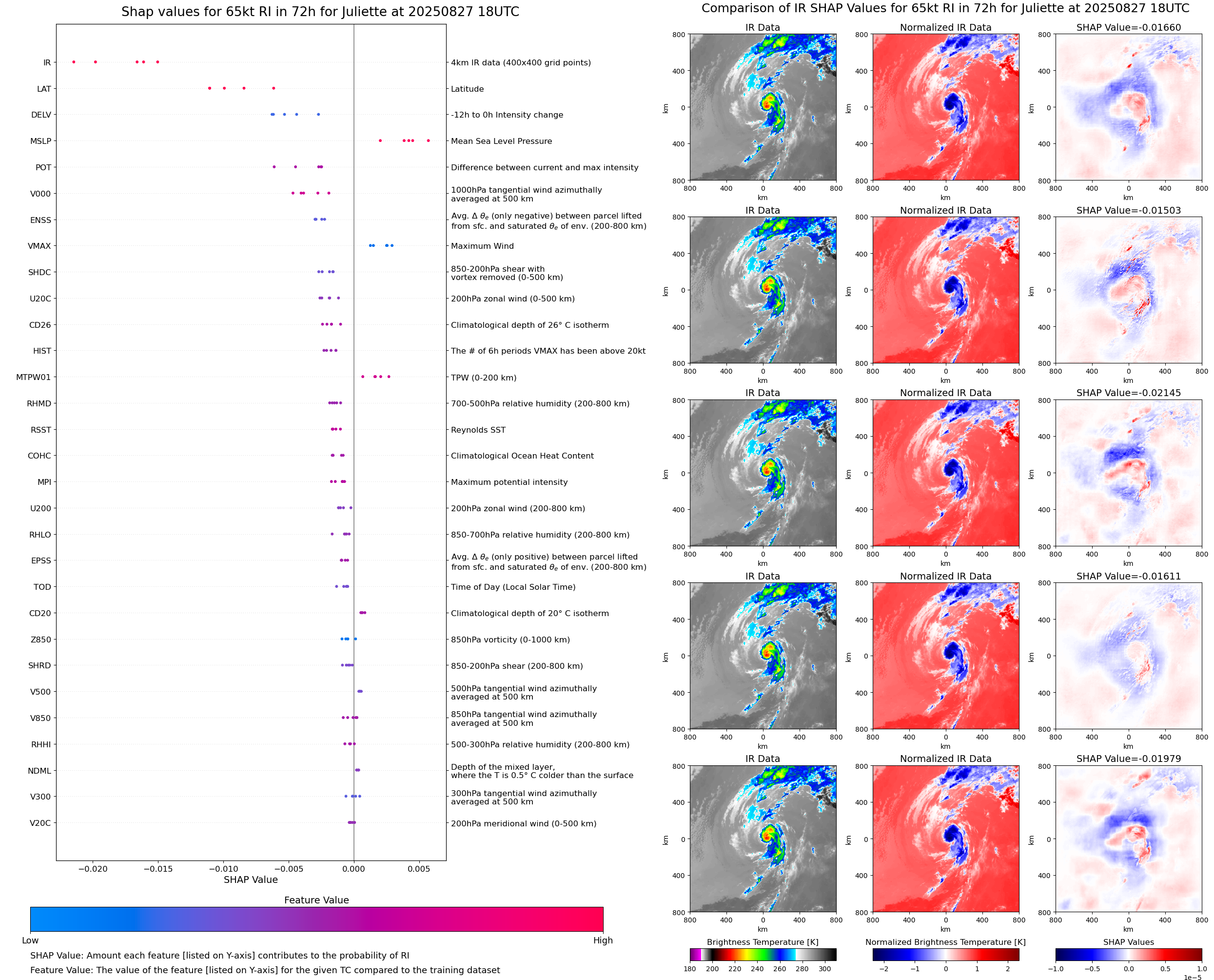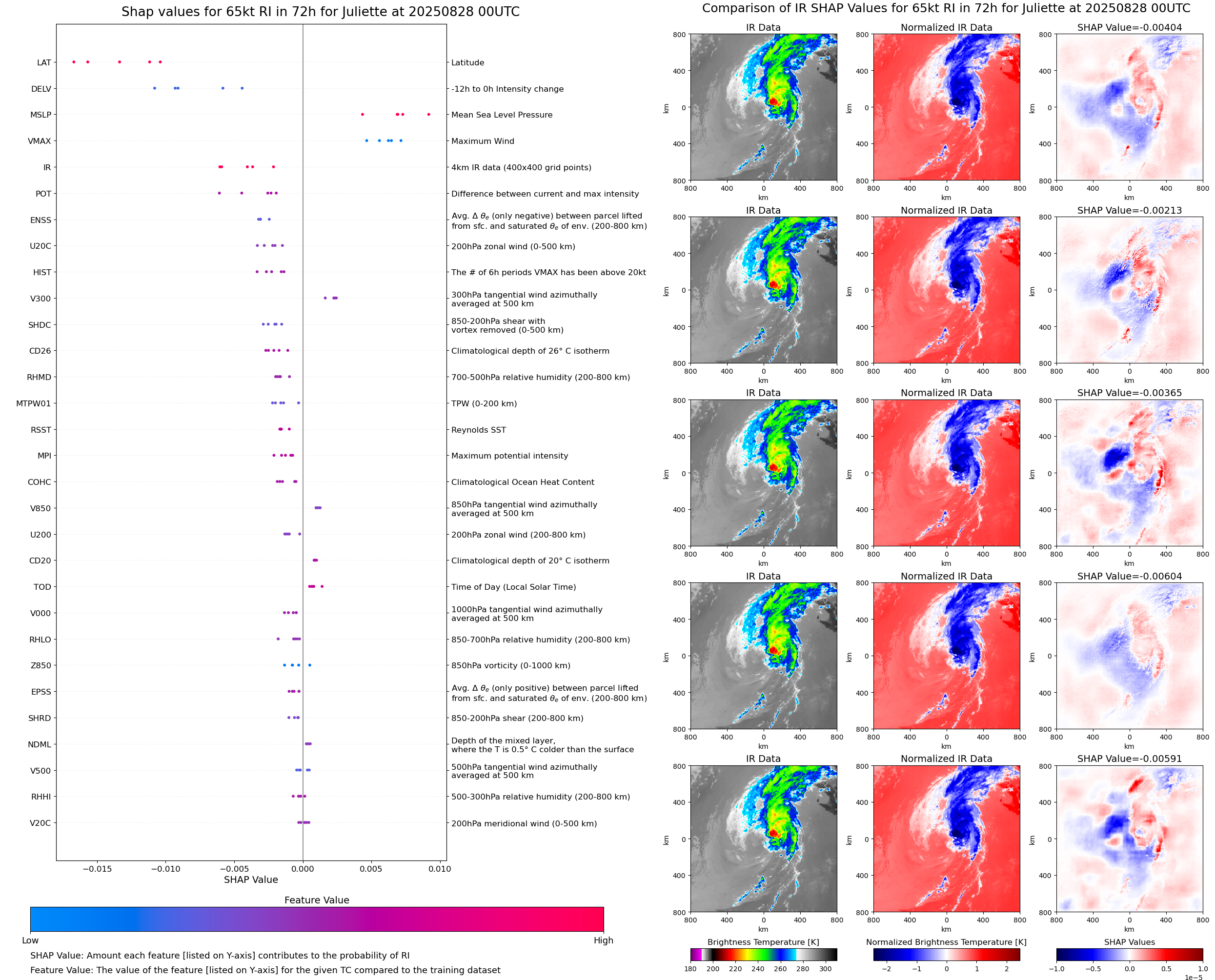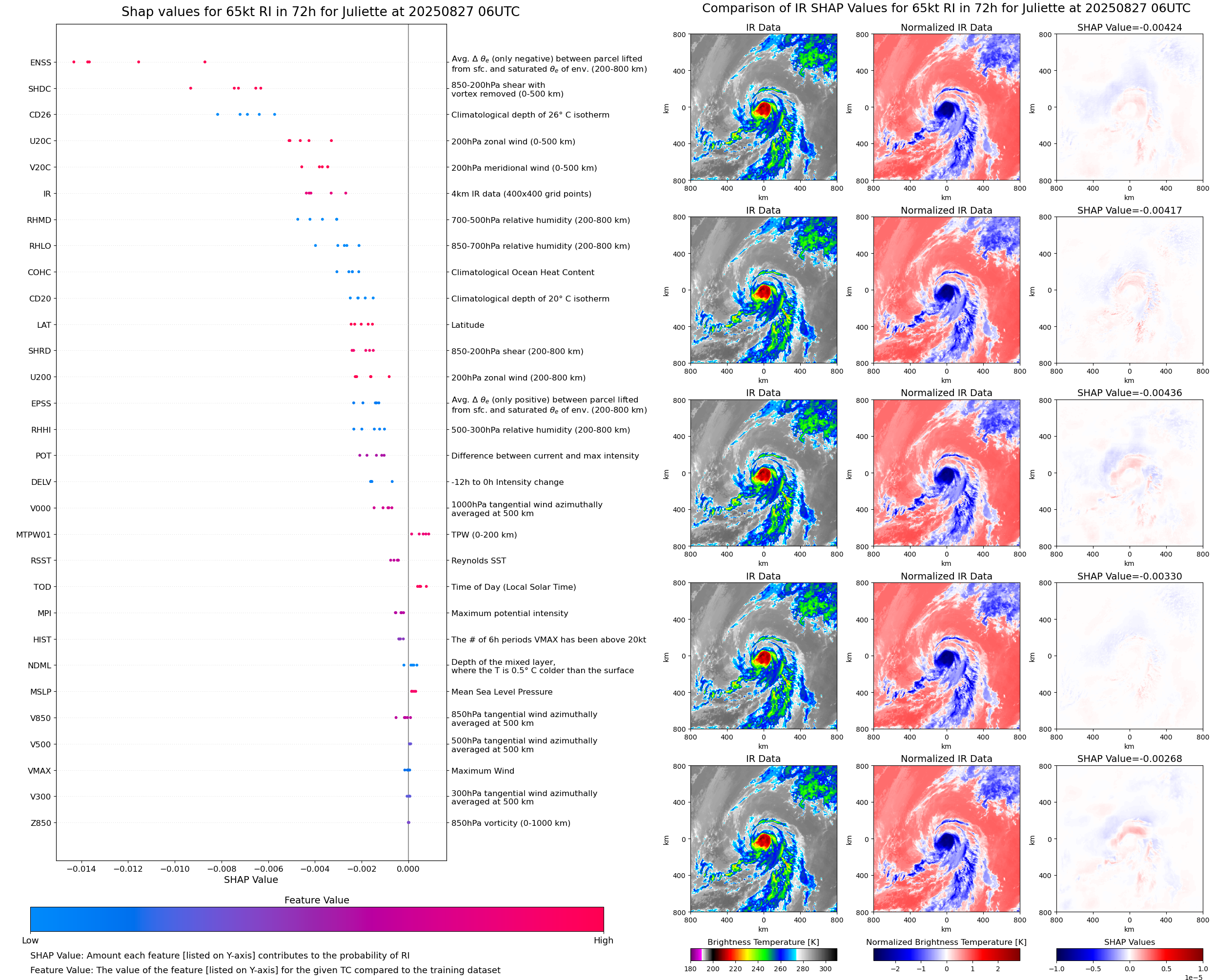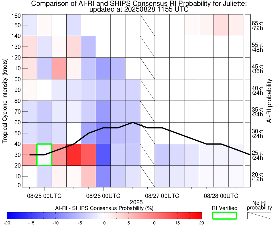 | Juliette at 08/27/25 00 UTC. Intensity = 55 kts, MPI = 76 kts |