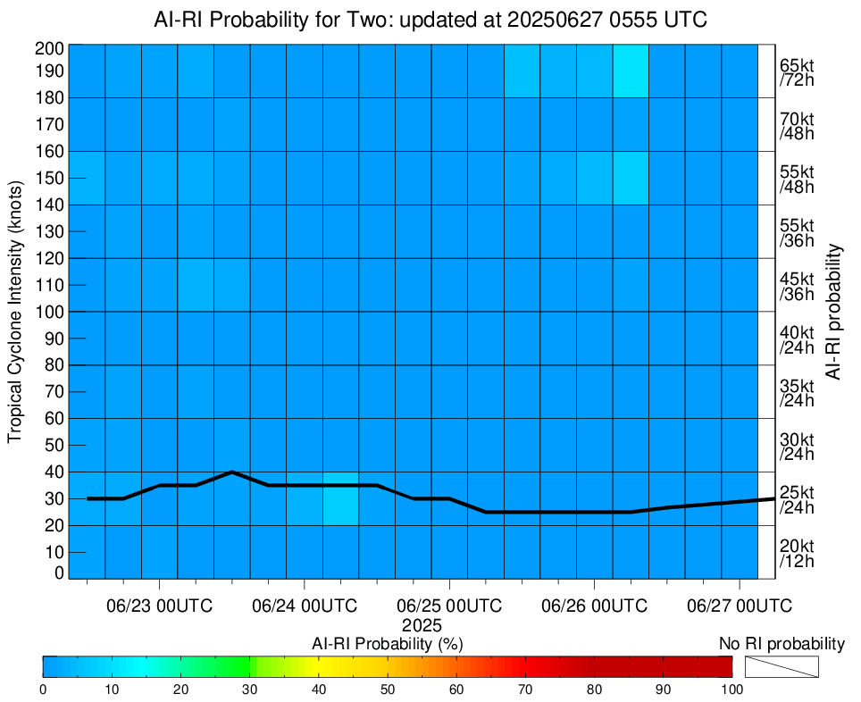 | Two at 06/26/25 12 UTC. Intensity = 30 kts, MPI = 9999 kts |