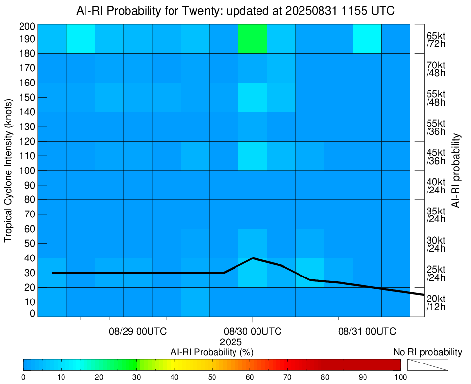 | Twenty at 08/29/25 12 UTC. Intensity = 30 kts, MPI = 9999 kts |