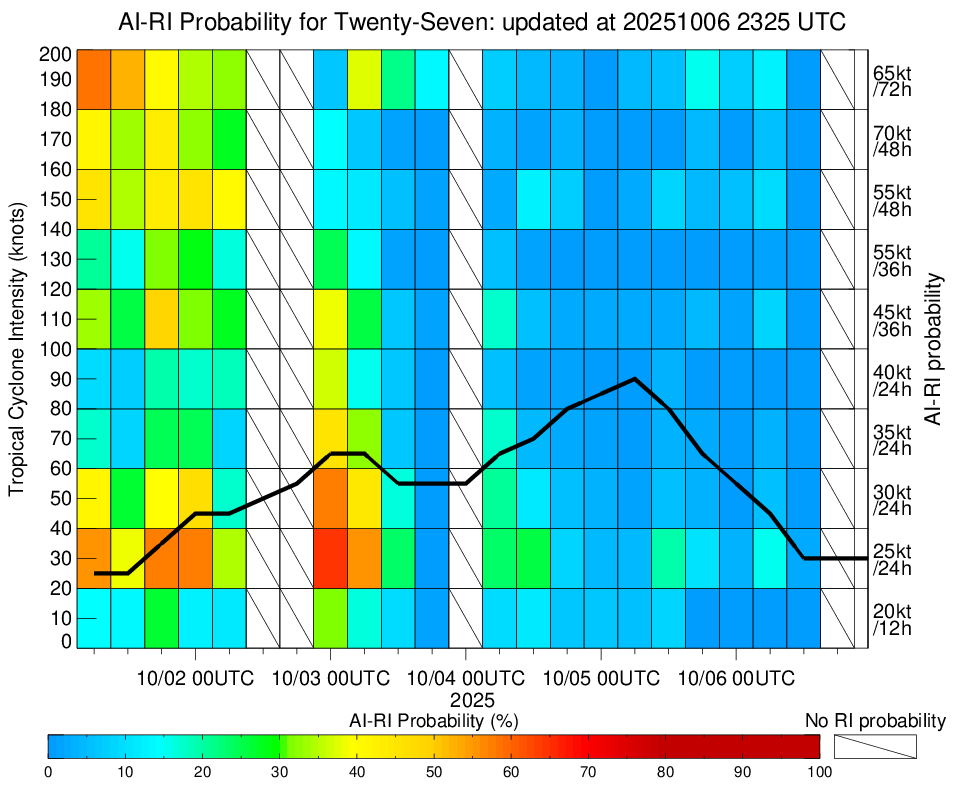 | Twentyseve at 10/01/25 12 UTC. Intensity = 25 kts, MPI = 9999 kts |