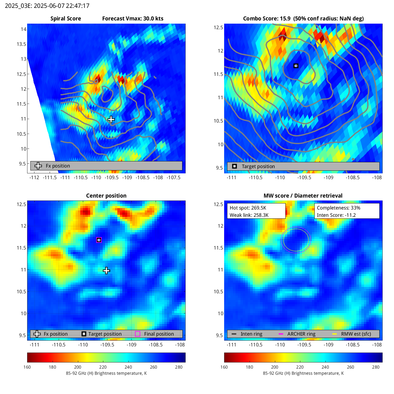 | 20250607T224717 | ssmis18_85 | 55.5 | 28.4 | 32.9% | 11.2 | -11.2 | n/a | 30.0 kts |