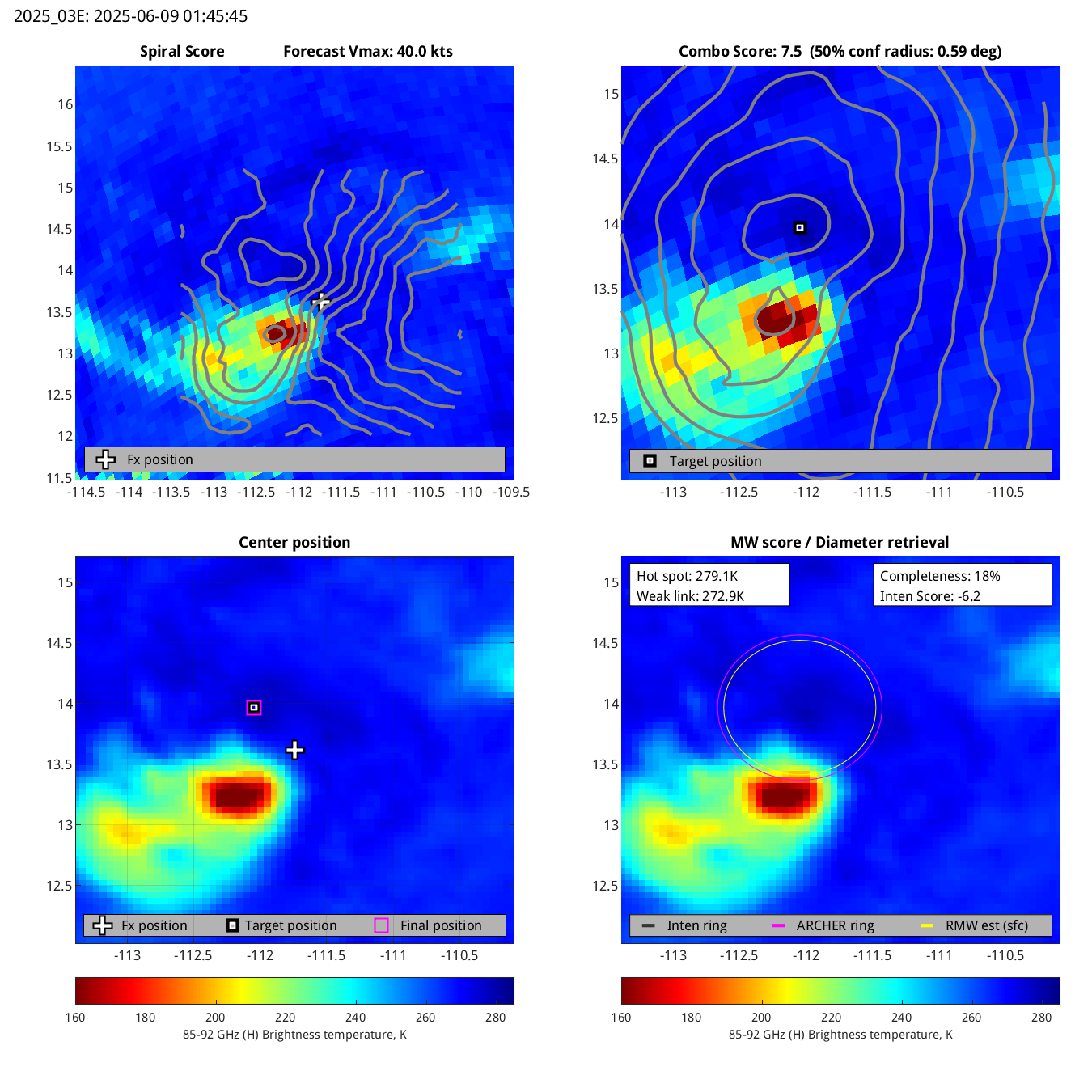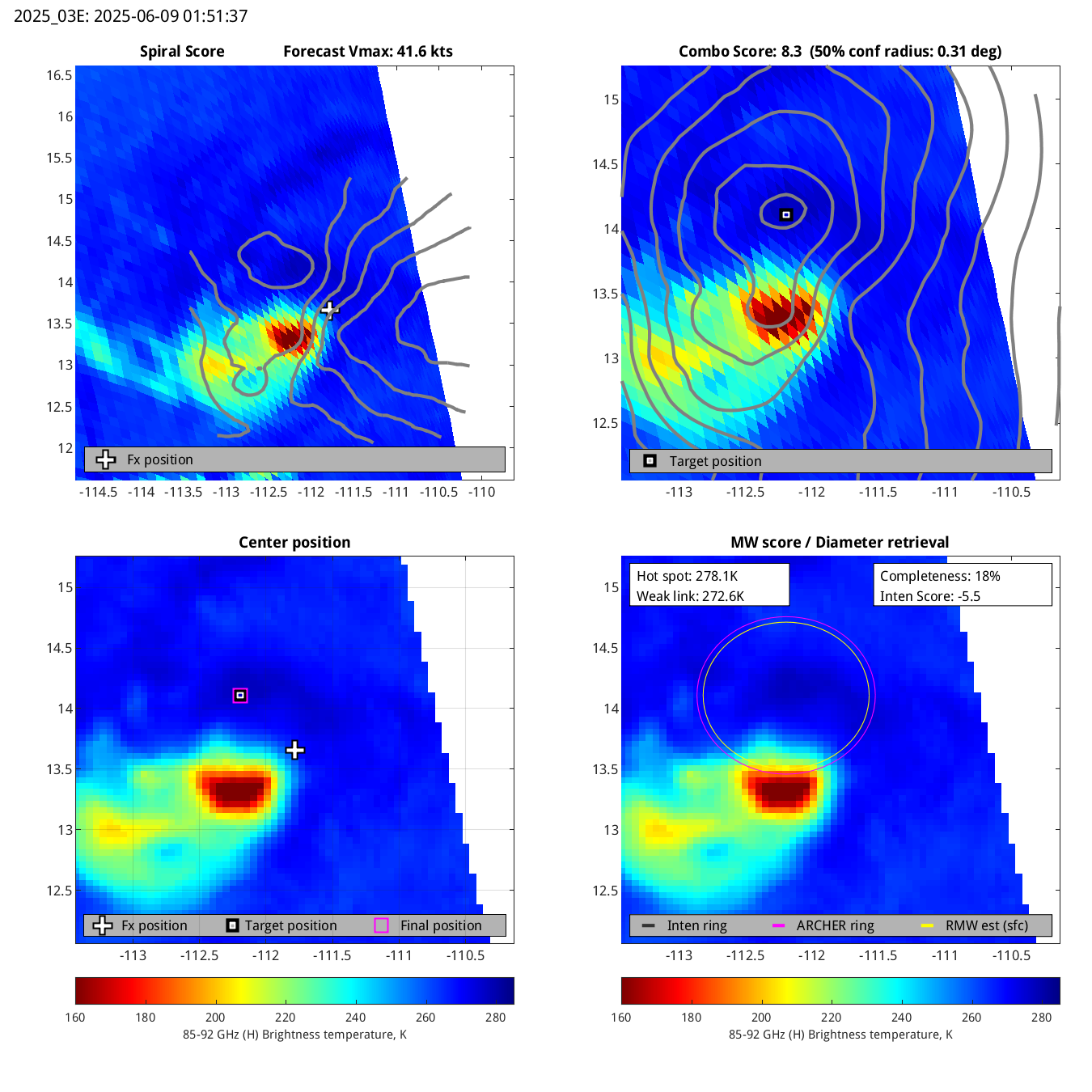 | 20250609T015137 | ssmis17_85 | 144.3 | 67.3 | 17.8% | 5.5 | -5.5 | n/a | 41.6 kts |