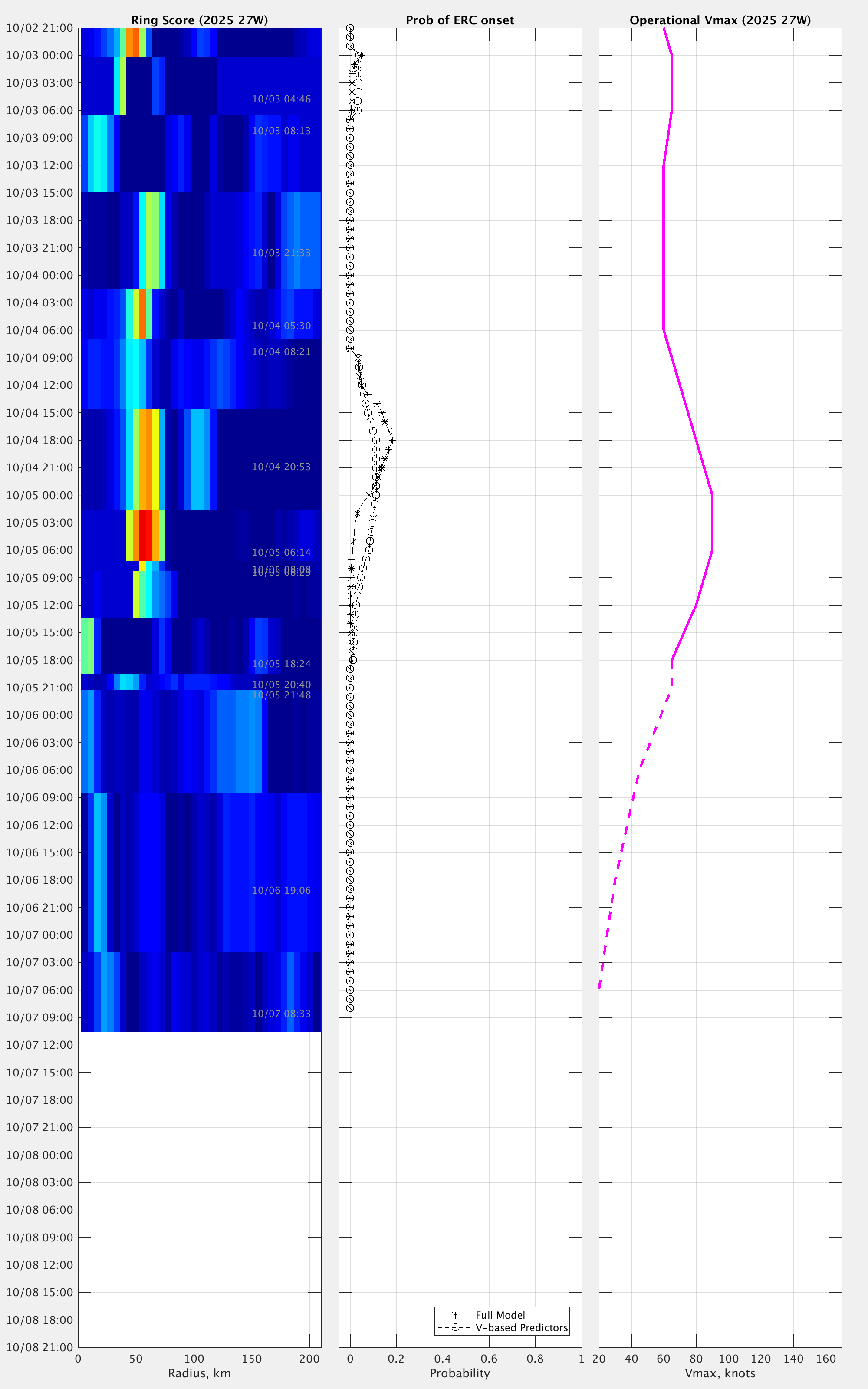 Vmax: Maximum winds listed in the forecast center analysis/forecast, *not* ARCHER.